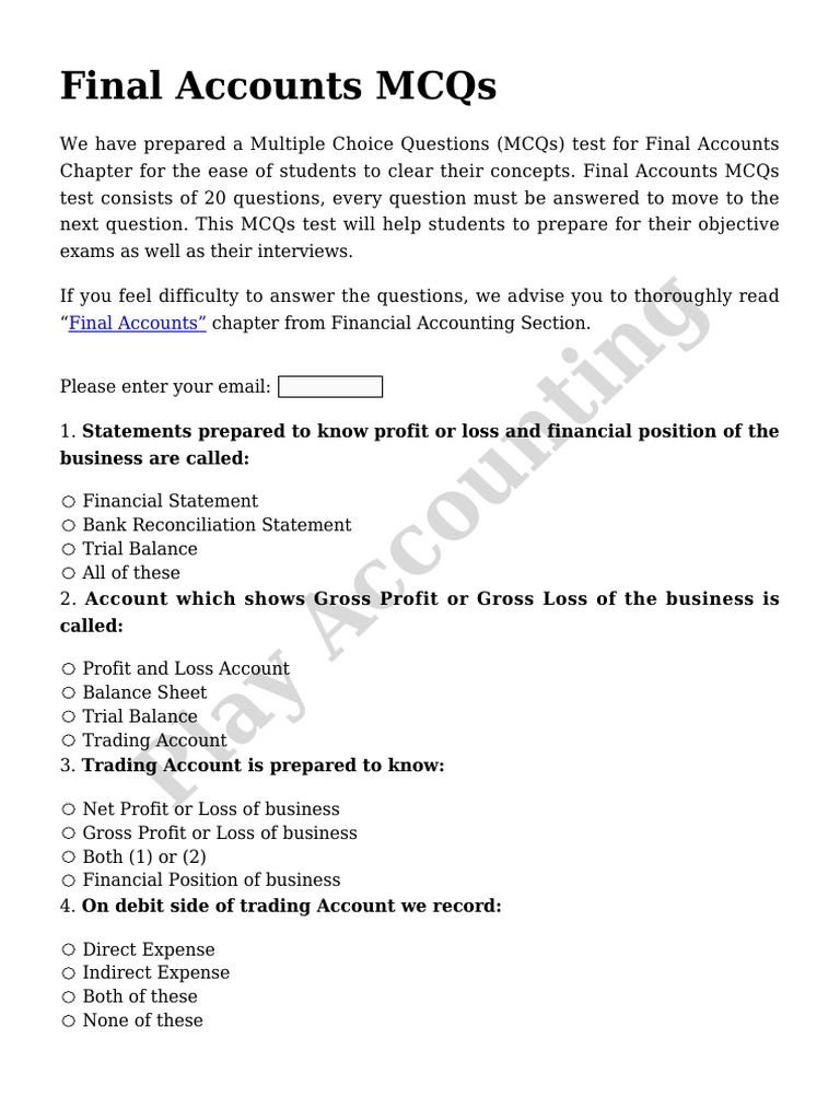 The form of balance sheet is mcq. MCQs BASED ON FINANCIAL STATEMENTS1 The financial statements consist of a Tribal balance b Profit and Loss account c Balance sheet d Both b and c 2 Income statements includes a Trading account b Profit and Loss account c Both a and b d Balance. 20 It is the last item to appear under Capital and liabilities of the Balance Sheet of a bank. Final accounts mcqs is a set of multiple choice questions.